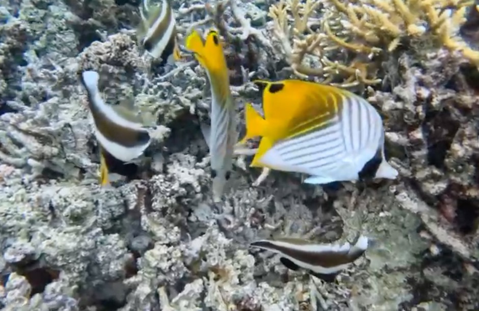 The second island we stayed at for three days was Moorea. Just like other posts on this site had described it, the snorkeling was wonderful at the Sofitel Kia Ora Moorea Beach Resort, on the left side of the overwater bungalows. The hotel had aged a little since I had been there about 15 years ago, having occasional problems with air-conditioning for example. But the snorkeling, even though the underwater scenery had changed, was lovely with much staghorn and other coral and bannerfish, blue chromis, a yellow pufferfish, and many other reef fish. We also did a picturesque and interesting land tour.