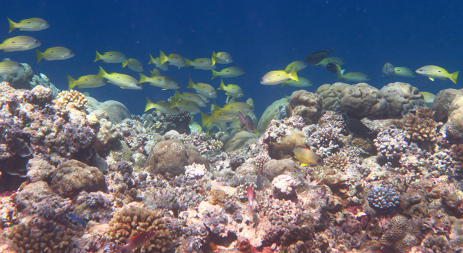 Inside the atoll around the many beautiful islands, are lagoon reefs. They shelter some unique corals and sea life. The sea life is different because these waters move much less with the tides than they do in and near the channels and on the outer walls of the atoll. That also means that the visibility is not crystal clear, but much of the sea life lives in the shallows, so you hardly notice.