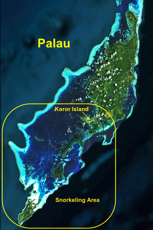 Palau is a small country and the area that people snorkel is quite small too. Koror is the main town, and island, in the country and it is basically in the middle of the atoll. All the snorkeling we did was south of Koror.